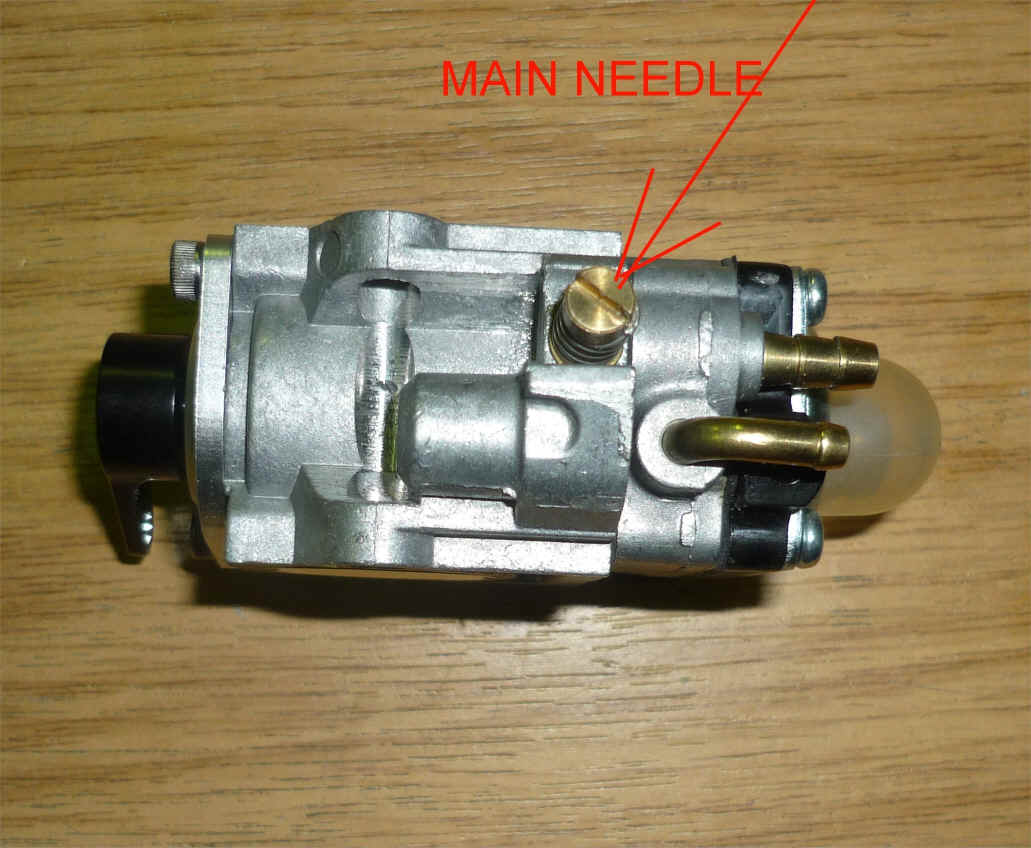 The very small mid range (sometimes called tickover) needle should be unscrewed until level with the large brass part, then screw it in 9 turns. This will be too rich on the midrange but is a good starting point. It is possible to screw the midrange in too far to give the perfect tickover but this can restrict fuel supply at full throttle and so a slightly rich midrange is preferred. Once a good setting is achieved it is recommended to use some low strength loctite on the screw threads to prevent it moving. The 2 brass nipples on the top are as follows.. The bent brass nipple is an overflow for the primer bulb. This can be left open or can be connected to a spare vent on the tank as an overflow return. When using an iv fuel bag this nipple should be left open The short brass nipple is the fuel inlet. Always use a very fine fuel filter in the fuel line.  On some versions of the manifold there is a nipple which must be connected to the nipple on the underside of the carb with the tygon tube provided.